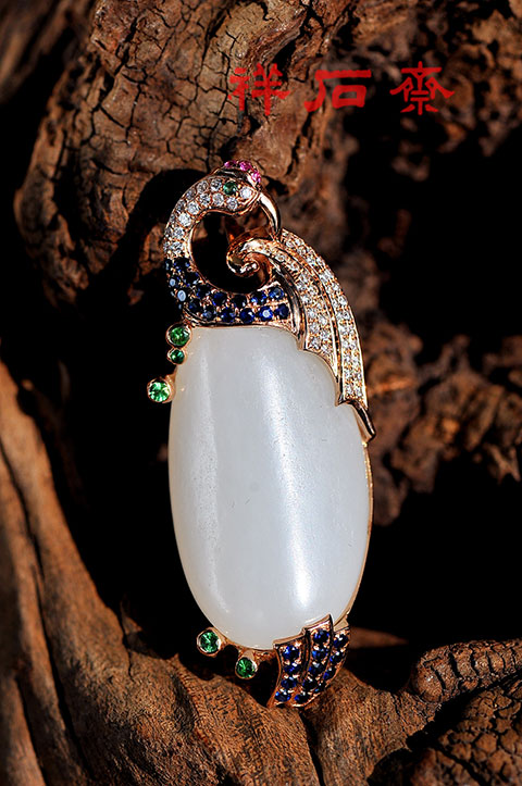 新疆和田玉白籽玉原石 18k玫瑰金镶天然宝石(红宝石、蓝宝石、沙弗莱、钻石)胸坠(独款手工定制经典版) 重量:11g