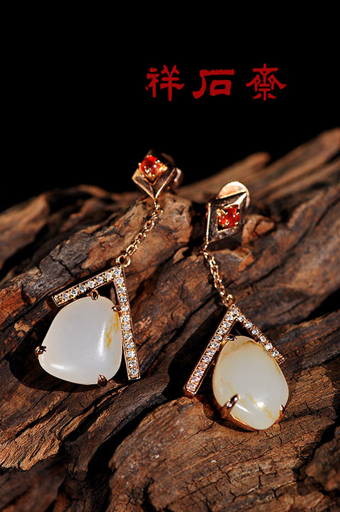 新疆和田玉白籽玉原石-18k玫瑰金镶天然彩宝(火欧泊、钻石)耳坠(独款手工定制创意版)-重量:7g