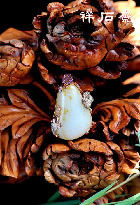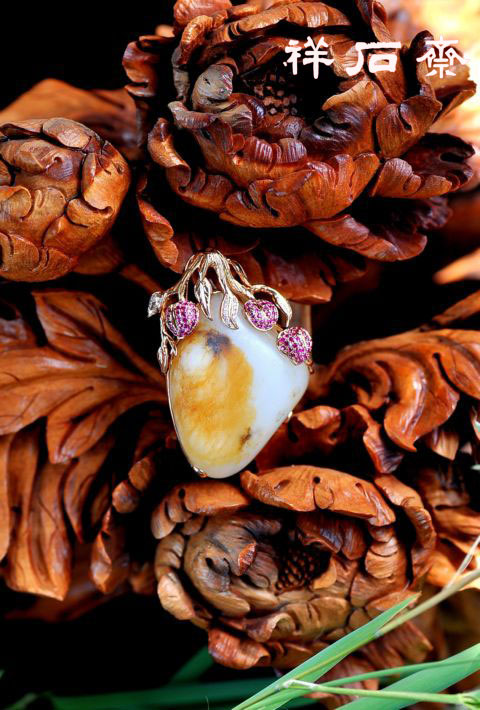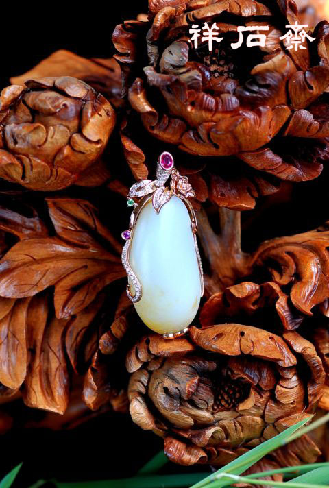 新疆和田玉白籽玉原石 18k玫瑰金镶钻镶红宝挂坠 32.18g
