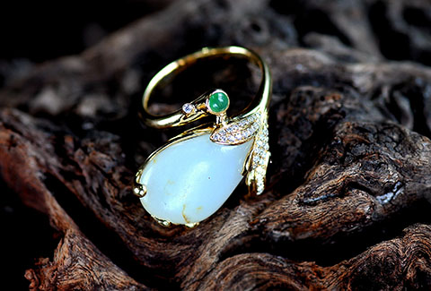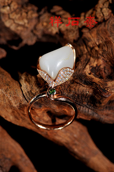 新疆和田玉白籽玉 原石戒指 18k金镶钻镶翡翠 9.34g
