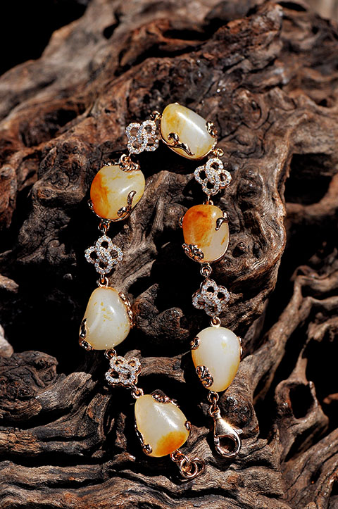 新疆和田玉白籽玉 原石手链 18k玫瑰金镶钻 26.53g